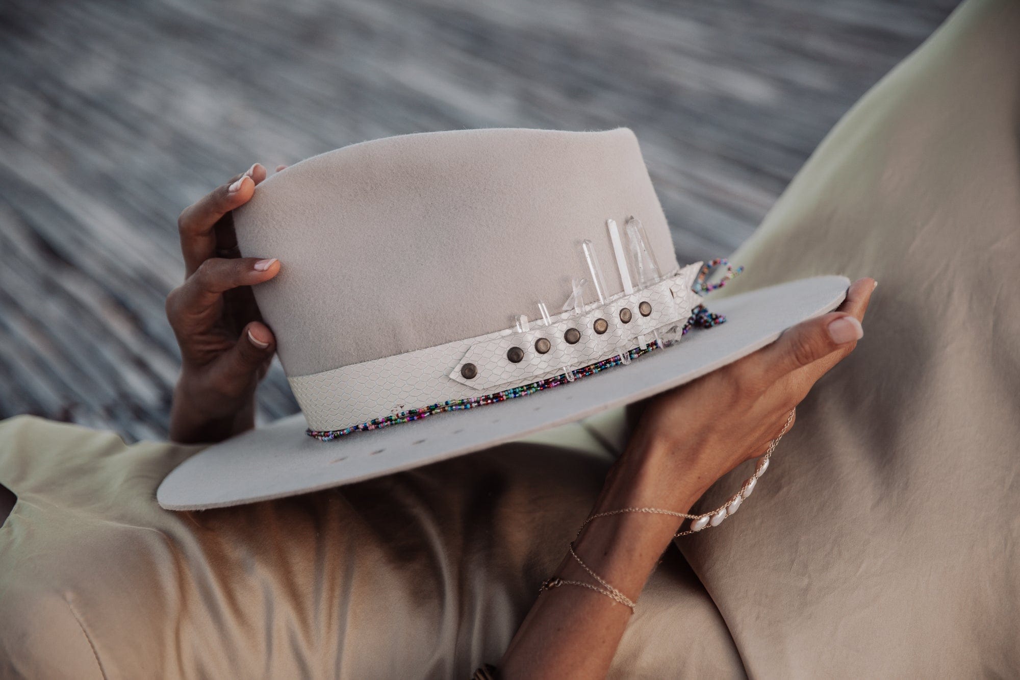 Candice" When Ivy, Zaid & I got on a call to create my Medicine Hat, I was so excited to see our vision come into form. When I first put it on, I felt its electric energy move through my body. Now it has been nearly 3 years and it is a staple piece and travels with me on nearly every adventure. Not only is my Medicine Hat beautiful to the eye, it holds a special magic that allows me to fully unlock & embody my divine feminine. It is a reflection of me. "
